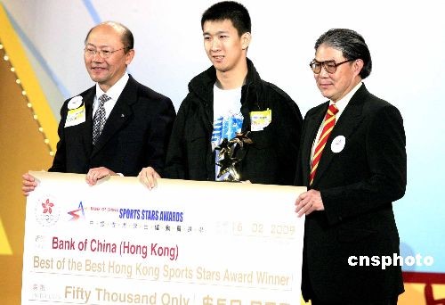 二月十六日,“2008中銀香港杰出運(yùn)動(dòng)員選舉”得獎(jiǎng)結(jié)果在香港會(huì)展中心舉行的頒獎(jiǎng)典禮上揭曉。圖為國(guó)際奧委會(huì)委員、中國(guó)香港體育協(xié)會(huì)暨奧林匹克委員會(huì)會(huì)長(zhǎng)霍震霆(右一)等為“中銀香港星中之星香港杰出運(yùn)動(dòng)員大獎(jiǎng)”獲獎(jiǎng)?wù)咛K樺偉(中)頒獎(jiǎng)。中新社發(fā) 張勤 攝