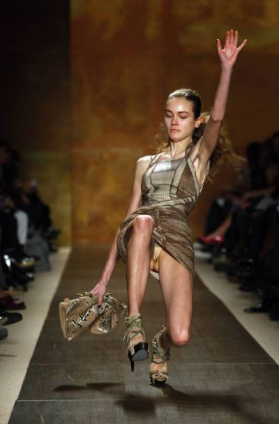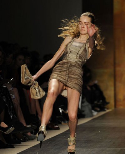 2月13日-15日,在紐約時(shí)尚周上,不斷有模特走秀時(shí)出現(xiàn)尷尬鏡頭,或者把鞋走丟,或者失足走光。