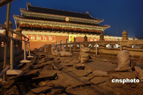2月18日,為迎接新中國成立60周年,天安門管委會從當(dāng)日起對金水橋?qū)嵤┍Wo(hù)修繕。據(jù)悉,此次修繕工作將分階段進(jìn)行,由于施工圍擋防火板高度有限,因此金水橋和天安門城樓的整體景觀和游覽不會受到太大影響。工程擬于2009年5月1日前完工,并整體對外開放。中新社發(fā) 鄭雄增 攝