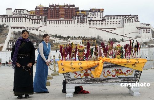 2月23日,拉薩布達(dá)拉宮廣場布置巨型“切瑪”迎接藏歷新年。現(xiàn)場這位藏族老阿媽稱這是她見過的最大的“切瑪”。藏歷新年時,藏族民眾家家戶戶供“切瑪”,人人都嘗“切瑪”。當(dāng)客人走進(jìn)藏民家時,主人首先會獻(xiàn)“切瑪”,客人從堆放在“缽”中的“切瑪”里拿出一點(diǎn)兒來,并說“扎西德勒”(吉祥如意之意),爾后放進(jìn)嘴里,預(yù)祝新春如意、身體康健。