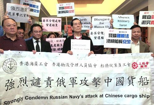 二月二十四日,香港船員及船務(wù)運輸業(yè)界代表前往俄羅斯駐香港領(lǐng)事館進行抗議,要求俄羅斯當(dāng)局嚴(yán)懲肇事者,并對死傷者負(fù)責(zé)。二月十五日,由香港船公司租憑的貨輪“新星號”遭俄羅斯海軍炮擊而沉沒,造成八名船員失蹤及死亡。中新社發(fā) 張勤 攝