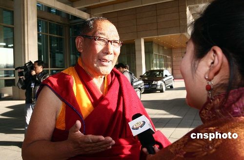 3月1日,來自西藏自治區(qū)的全國政協(xié)委員旦白尼瑪?shù)诌_(dá)北京首都機(jī)場(chǎng)后接受記者采訪。2OO9年全國“兩會(huì)”即將開幕,代表、委員們已開始陸續(xù)抵京報(bào)到。中新社發(fā) 杜洋 攝