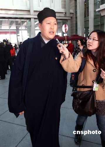 3月1日,赴北京參加“兩會”的全國政協委員、四川省道教協會會長、青城山天師洞道觀道長唐誠,剛一抵達北京機場就被記者追訪。2OO9年全國“兩會”即將開幕,代表、委員們已開始陸續(xù)抵京報到。中新社發(fā) 杜洋 攝