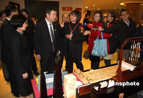 圖為鄭欣淼(左二)在臺北故宮博物院院長周功鑫(左一)的陪同下,參觀臺北故宮博物院禮品部,并觀賞依據(jù)唐懷素自敘帖制作的禮品。