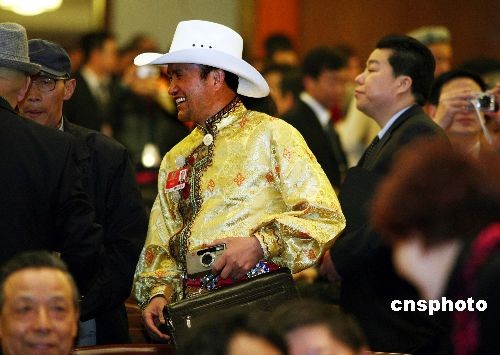 全國政協(xié)十一屆二次會議3月3日下午在人民大會堂開幕,一名少數(shù)民族委員攜相機和電腦出席大會。中新社發(fā) 宋吉河 攝