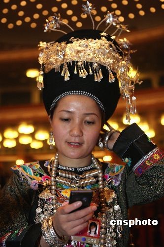 3月4日上午,十一屆全國人大二次會議預備會在北京人民大會堂舉行。來自重慶市黔江區(qū)的苗族女代表李小燕通過手機向家鄉(xiāng)“播報”大會盛況。中新社發(fā) 任晨鳴 攝
