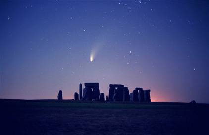 本圖是1997年海爾-波普彗星飛越巨石陣上空時(shí)被攝影師拍下來(lái)的照片。西蒙斯認(rèn)為,這幅圖也許可以將人類的現(xiàn)在與過(guò)去和將來(lái)聯(lián)系到一起。該彗星上次出現(xiàn)于巨石陣上空大約是4000千年前。當(dāng)它再一次回來(lái)時(shí),預(yù)計(jì)是在2000年后。英國(guó)巨石陣大約建于公元前3100年。關(guān)于巨石陣的用途,至今頗具爭(zhēng)議。有人認(rèn)為這是一種典型的古代葬禮或祭祀遺址,同時(shí)也有人認(rèn)為它還是一種天文觀測(cè)站。一圈高大的石塊與一些豎立的巨石形成了一個(gè)半開口形狀的陣列。開口方向恰好指向夏至日太陽(yáng)升起的方向。矗立在英國(guó)南部索爾茲伯里平原上的巨石陣,是英國(guó)最重要、最神秘的歷史遺跡之一。多數(shù)考古學(xué)家認(rèn)為,它既是天文觀測(cè)站,也是古代宗教遺跡。