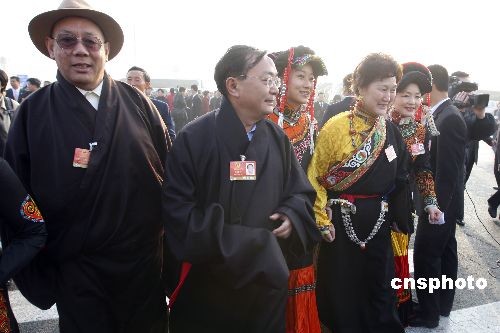 3月5日上午,十一屆全國(guó)人大二次會(huì)議在北京人民大會(huì)堂開(kāi)幕。來(lái)自四川的全國(guó)人大代表甲登·洛絨向巴、李昌平等一同步入會(huì)場(chǎng)。中新社發(fā) 盛佳鵬 攝