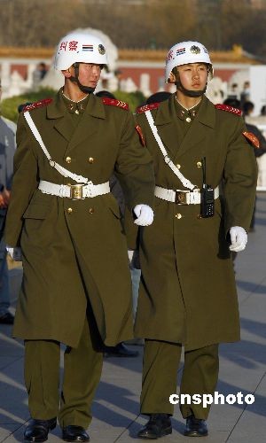 3月5日,中國(guó)軍隊(duì)糾察士兵在北京天安門廣場(chǎng)檢查軍容軍紀(jì)。中新社發(fā) 鄭雄增 攝