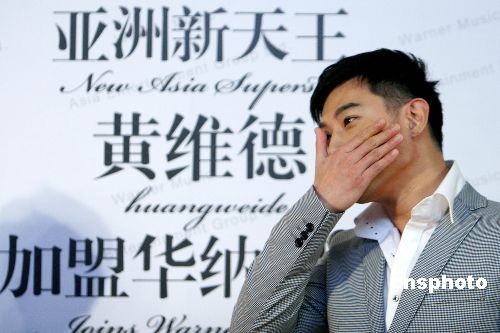 2009年3月9日,臺(tái)灣影視紅星黃維德加盟華納唱片簽約發(fā)布會(huì)在北京隆重舉行。蔡依林恩師陳澤杉送上繡有“金榜題名”的卷軸。事逢前日伊能靜博客突發(fā)感言表明已和庾澄慶離婚,使?fàn)渴珠T中的主角黃維德再次被推上風(fēng)口浪尖。發(fā)布會(huì)中黃維德感嘆生活多揣,看到依舊堅(jiān)定支持的歌迷突然落淚、抽咽。隨后的媒體訪問(wèn)在問(wèn)題逐漸深入的過(guò)程中黃維德最終難再支撐,匆匆離去。中新社發(fā) 袁方 攝