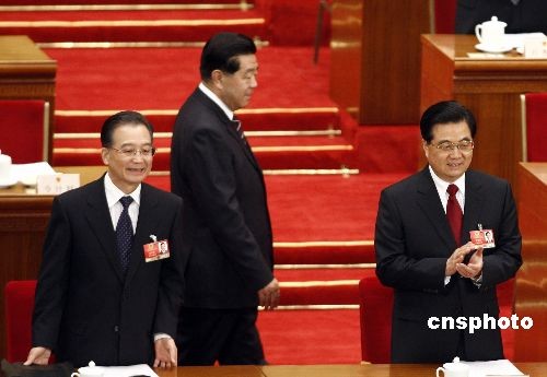 3月10日,十一屆全國人大二次會(huì)議舉行第三次全體會(huì)議,最高人民法院院長王勝俊、最高人民檢察院檢察長曹建明分別作工作報(bào)告。圖為國家主席胡錦濤、國務(wù)院總理溫家寶、全國政協(xié)主席賈慶林出席全體會(huì)議。中新社發(fā) 盛佳鵬 攝