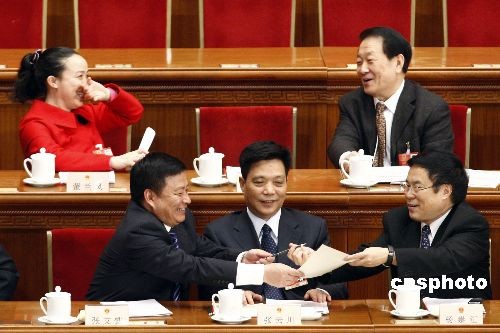3月10日,第十一屆全國(guó)人民代表大會(huì)第二次會(huì)議在人民大會(huì)堂舉行第三次全體會(huì)議,聽(tīng)取最高人民法院院長(zhǎng)王勝俊作最高人民法院工作報(bào)告;聽(tīng)取最高人民檢察院檢察長(zhǎng)曹建明作最高人民檢察院工作報(bào)告。圖為會(huì)議開(kāi)始前已在主席臺(tái)就坐的人大代表交談。中新社發(fā) 盛佳鵬 攝