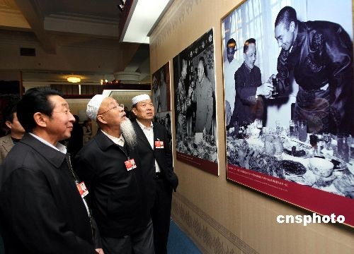 3月11日,參加全國(guó)政協(xié)會(huì)議的回族委員參觀在北京民族宮舉辦的西藏民主改革50年大型展覽。墻上照片為1959年時(shí)任國(guó)務(wù)院副總理的鄧小平與班禪大師在一起。中新社發(fā) 傅丹丹 攝
