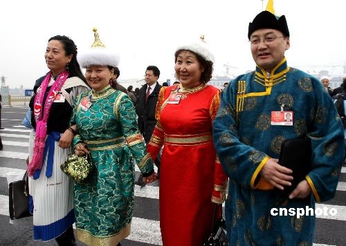圖:少數(shù)民族委員盛裝步入大會堂——中新網(wǎng)