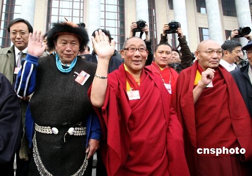 3月12日,全國(guó)政協(xié)十一屆二次會(huì)議閉幕。圖為來(lái)自西藏的宗教界委員阿旺吉卓(中)走出會(huì)場(chǎng)。中新社發(fā) 傅丹丹 攝