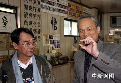 3月14日,由臺(tái)北縣政府文化局委托的專家組在“臺(tái)北縣博物館家族”之一的陳逢顯毫芒雕刻博物館內(nèi)調(diào)研。圖為臺(tái)灣著名微雕家陳逢顯(右一)向?qū)<医M成員展示他以臺(tái)北故宮博物院所藏“多寶閣”果核微雕作品為范本,正在以橄欖核進(jìn)行雕刻的作品。 作者:陳立宇