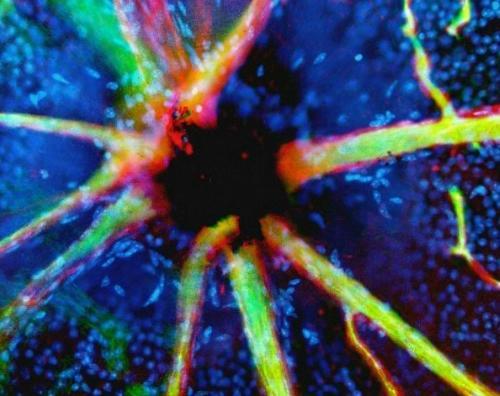 從視神經(jīng)中伸出的血管:這張照片顯示的是血管從黑色視盤中伸出。視盤是個盲點,因為視網(wǎng)膜的這個區(qū)域沒有光感細胞,視神經(jīng)和視網(wǎng)膜血管從眼睛后面的這個部位伸出去。