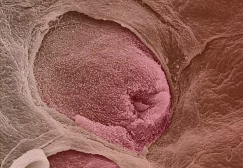 舌頭上的味蕾:這張彩色圖片上顯示的是舌頭上的一個味蕾。人舌上大約擁有10000個味蕾,味蕾所感受的味覺可分為甜、酸、苦、咸四種。