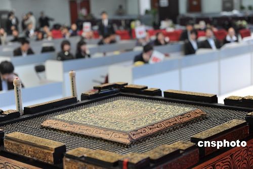3月18日,2008北京第29屆奧運(yùn)會(huì)開幕式演出道具“缶”最后一場(chǎng)專場(chǎng)拍賣在北京產(chǎn)權(quán)交易所完美落槌。22個(gè)標(biāo)的共320個(gè)缶以總價(jià)4138萬(wàn)元拍出。此外10個(gè)標(biāo)的共200幅竹簡(jiǎn)以總價(jià)637.5萬(wàn)元成交。共有132家單位和個(gè)人參與了此次競(jìng)買,單個(gè)“奧運(yùn)缶”的成交均價(jià)12.93萬(wàn)元,超過(guò)第一批“奧運(yùn)缶”成交均價(jià)一倍有余,單個(gè)“竹簡(jiǎn)”成交均價(jià)3.18萬(wàn)元。中新社發(fā) 遠(yuǎn)舟 攝