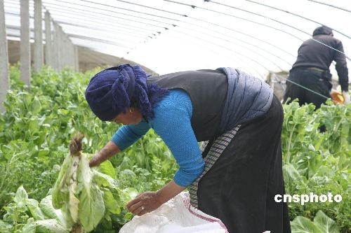 近年來,用溫室大棚種植蔬菜在西藏日益推廣。在強(qiáng)烈的日光照射下,大棚內(nèi)溫暖如春。就是在青黃不接的冬春時(shí)節(jié),大棚內(nèi)都可生長各種新鮮蔬菜供應(yīng)市場(chǎng)。圖為3月17日拉薩近郊曲水縣的一對(duì)藏族夫婦在收獲大白菜。中新社發(fā) 王林 攝