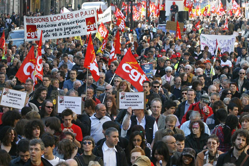 3月19日法國各大工會在全國各地聯(lián)合組織罷工和示威游行等活動,抗議政府在應對當前經(jīng)濟危機過程中忽視勞動者權益和社會福利。