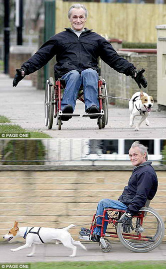 英殘疾者訓(xùn)練狗拉輪椅。據(jù)英國(guó)《每日郵報(bào)》報(bào)道,一只3歲大的杰克羅素梗每天為其殘疾主人拉輪椅,它已成為主人輪椅的小型發(fā)動(dòng)機(jī)。除非遇到車(chē)輛、貓和令其感興趣的氣味,否則它不會(huì)停下來(lái)。這只名叫科迪的杰克羅素梗套著特制的挽具,每天都拉著其主人艾倫-史密斯在諾丁漢郡克利夫頓外出兜風(fēng)。57歲的史密斯稱(chēng),他的這只寵物犬拉輪椅的時(shí)速可達(dá)24公里。史密斯因幼時(shí)患小兒麻痹癥而殘疾,不得不坐輪椅,史密斯49歲的妻子多娜一直負(fù)責(zé)照顧他。史密斯說(shuō):“科迪會(huì)在道路交叉處停下來(lái),看看是否有車(chē)輛。它的唯一缺點(diǎn)是,如果看到了一只貓或者另一只狗,它會(huì)停下來(lái),像老虎那樣臥著。它的肌肉很強(qiáng)健,獸醫(yī)說(shuō),它非常健康!笔访芩狗Q(chēng),令人感到奇怪的是,科迪只吃超市出售的一種品牌為“英雄”的狗糧。他說(shuō):“它不吃其它食物,我們?cè)嚵怂衅渌澄铩!?table border=0 cellspacing=0 cellpadding=0 align=left>