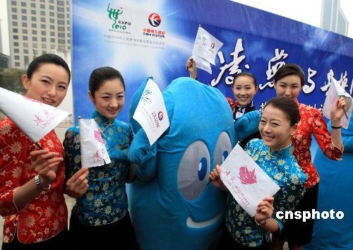 2009年3月27日,上海世博會(huì)倒計(jì)時(shí)400天,東方航空公司的中、日、韓籍空姐及“凌燕世博乘務(wù)組”,冒雨在上海人民廣場參與上海世博推廣公益活動(dòng)。中新社發(fā) 潘索菲