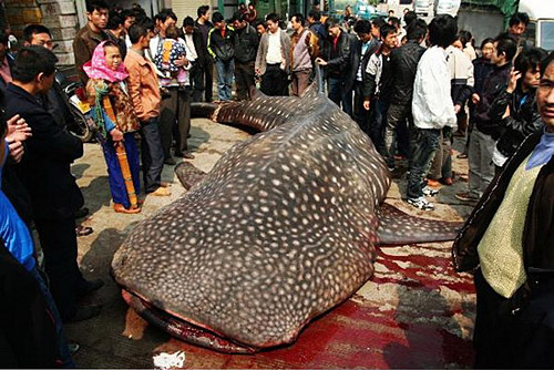 4月1日上午,在福建石獅祥芝水產(chǎn)品批發(fā)市場一塊空曠的地面上一市民稱有漁民捕獲了一條重達兩三噸的大鯊魚,已送到祥芝水產(chǎn)品批發(fā)市場販賣。