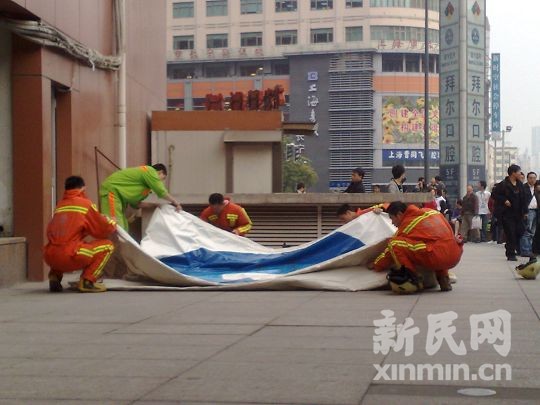 記者16時45分許趕到龍之夢時看到,一名頭發(fā)散亂的男子雙腳懸空坐在大廈9樓平臺一側(cè),警方已在地面圍起了警戒線,消防人員也架起了救生氣墊。由于事發(fā)現(xiàn)場位處交通繁忙的長寧路凱旋路口,四周又匯集了軌道2、3、4號線車站,引起了上百名路人駐足圍觀。