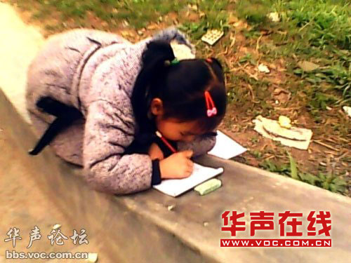 “盡管是初春,但若有若無的雨絲,也讓人忍不住要裹緊衣服。女孩一直在專心地做著作業(yè),并沒有因?yàn)樘葑由厦嬗腥俗呦聛矶艿接绊。”發(fā)帖人稱自己在一個小區(qū)工地發(fā)現(xiàn)這名小女孩并和她攀談起來:“我問她為什么不回家,偏偏跑到有雨的外面做作業(yè)?她調(diào)皮地朝我做了一個鬼動作,‘我媽媽叫我在這里做作業(yè)。”