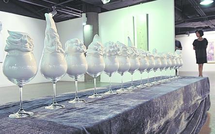 25日下午,記者在水碾河藍(lán)色空間畫廊內(nèi),在剛剛布展完畢即將在26日下午正式開展的“新生———西南地區(qū)美術(shù)院校在校生選拔展中美巡展”中國站展覽的展廳里,一組15個遠(yuǎn)遠(yuǎn)看去完全就是冰淇淋一般的雕塑作品立即吸引了記者的注意。這組名為《石膏達(dá)斯》的雕塑,全部是用高腳紅酒杯盛裝的,雪白的“冰淇淋”從杯底一直延伸到杯口,并形成各式各樣的宛如冰淇淋塔尖的形狀,但走近仔細(xì)觀看,卻發(fā)現(xiàn)這些冰淇淋塔尖其實都是一個個物體的變形,有汽車,有肯德基老人,有狗……25日記者通過電話聯(lián)系到了身在北京的參展藝術(shù)家、這些“冰淇淋”的作者張華,他表示,這些作品的靈感正是來自于冰淇淋,當(dāng)時他覺得冰淇淋塔尖的形狀變換很有意思,于是想到了把生活中常見的消費場所、消費標(biāo)志、人物、動物融入冰淇淋式的雕塑中,我覺得“這既是一種好玩的雕塑,又是一種反映消費社會現(xiàn)實的雕塑”。記者了解到,這些冰淇淋的雕塑售價令人咋舌:一組15個,售價5萬元,也就是說每個售價約等于3333元!