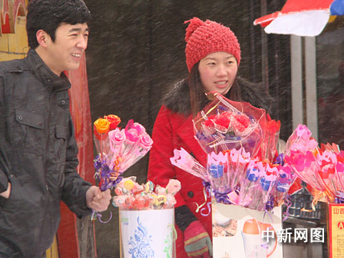 中新網(wǎng)2月14日電(高增平)14日上午,山西呂梁市區(qū)世紀(jì)廣場附近不少護(hù)花使者冒著小雪在擺放的各式各樣的玫瑰花。人們注意到,今天當(dāng)?shù)亟诸^許多過往車上也乘機(jī)擺放出巧克力招引著青年人方便為情侶送出禮物。