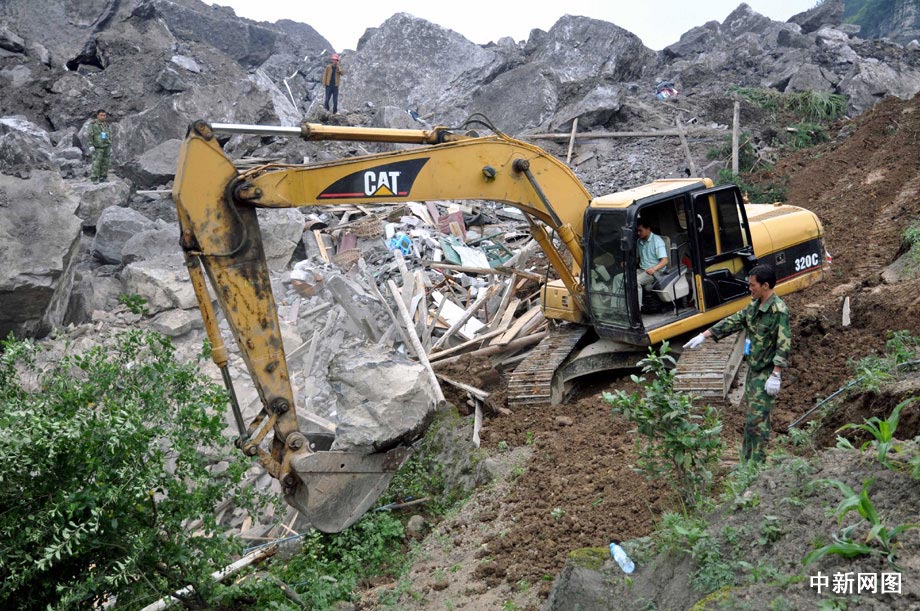 因垮塌的民房為兩層樓混泥土結(jié)構(gòu),且上有土石堆積,只攜帶了簡(jiǎn)易救援工具的救援官兵難以快速搜救被埋者。6月7日15時(shí)許,第一臺(tái)型號(hào)為CAT320C的中型挖掘機(jī)駛進(jìn)垮塌現(xiàn)場(chǎng)進(jìn)行挖掘作業(yè)。 曹多然 攝