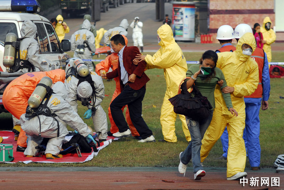 緊隨其后進(jìn)場的是防化醫(yī)學(xué)救援隊(duì)。該分隊(duì)指揮員帶領(lǐng)后續(xù)偵察分隊(duì)、洗消分隊(duì)和化驗(yàn)組,分別乘坐4輛防化偵察車、1輛淋浴車和1輛防化化驗(yàn)車入場。穿藍(lán)色和橙色防護(hù)服的防化醫(yī)學(xué)救援隊(duì)入場后,醫(yī)療衛(wèi)生人員迅速展開裝備,組織檢驗(yàn)監(jiān)測,開設(shè)臨時醫(yī)療所,區(qū)分觀察區(qū)、檢診區(qū)、洗消區(qū)和處置區(qū),救護(hù)車開始中毒人員轉(zhuǎn)運(yùn)。 郝飛 攝