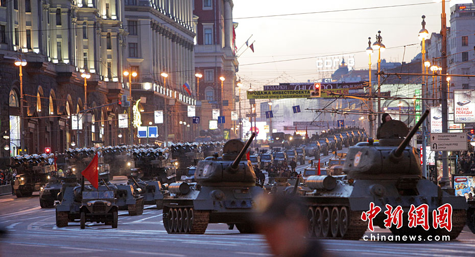 此次紅場閱兵包括兩部分內(nèi)容:歷史部分和現(xiàn)代部分。歷史部分由身穿衛(wèi)國戰(zhàn)爭時(shí)期軍服的士兵在鵝卵石道上進(jìn)行,同時(shí)還會(huì)有9輛T-34坦克和8輛SU-100自行火炮,F(xiàn)代部分由13輛老虎裝甲車、BTR-80裝甲車、BMP-3步兵戰(zhàn)車、T-90A坦克和S-400防空系統(tǒng)等。圖片來源:中國新聞網(wǎng)