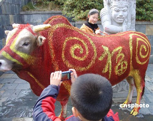 牛年春節(jié)將近,長沙世界之窗內(nèi)愛玩的孩子們圍著一頭黃牛,為它涂上絢麗的色彩,形成創(chuàng)意十足的“!弊謭D案,用時尚的彩牛迎接即將到來的牛年春節(jié)。中新社發(fā) 肖前輝 攝