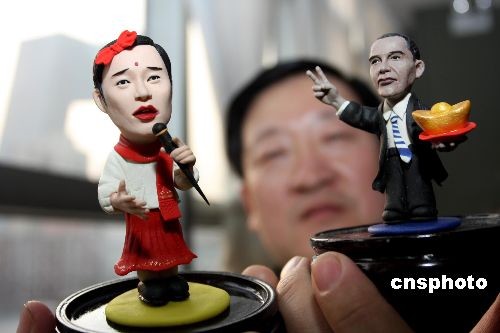 2月8日,北京朝陽區(qū)文化館,非物質(zhì)文化遺產(chǎn)項目傳承人“面人彭”彭小平,展示他精心制作的面人新作品——小沈陽和奧巴馬。當日,為迎接正月十五元宵節(jié),朝陽區(qū)文化館舉辦非物質(zhì)文化遺產(chǎn)手工藝作品交流活動,10余位民間藝術(shù)家進行現(xiàn)場技藝展示。中新社發(fā) 鄭雄增 攝