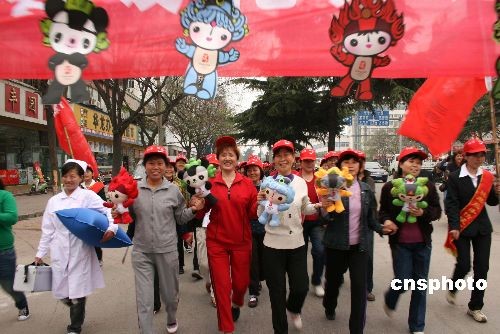 4月7日,河南南陽(yáng)市臥龍區(qū)60多位社區(qū)大媽以慢跑形式,迎接北京奧運(yùn)會(huì)。本次名為“春暖花開(kāi)迎奧運(yùn)”的慢跑活動(dòng),總路程為五公里,大媽們以飽滿的精神、驕健的步伐充分釋放喜迎奧運(yùn)的激動(dòng)心情。中新社發(fā) 付海厚 攝