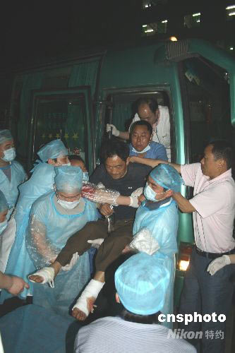 5月15日23時(shí),又一批90名從地震重災(zāi)區(qū)四川綿竹市的傷員,被連夜運(yùn)到眉山市第二人民醫(yī)院,當(dāng)?shù)蒯t(yī)務(wù)人員、青年志愿者和剛剛趕到這里增援的吉林省醫(yī)療隊(duì)等數(shù)百人齊心協(xié)力,經(jīng)過1個(gè)小時(shí)的奮斗后把這批傷員安置到病房,并立即展開救治。中新社發(fā) 堯遙 攝