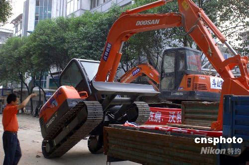 2008年5月15日,地震災(zāi)區(qū)都江堰市危樓排險(xiǎn)工作正在進(jìn)行中。目前來(lái)自成都市企業(yè)的志愿抗震救災(zāi)隊(duì)伍攜帶大型機(jī)械車(chē)輛開(kāi)進(jìn)都江堰市區(qū),與解放軍部隊(duì)一起展開(kāi)危樓居民區(qū)的排險(xiǎn)、救災(zāi)、防疫工作。圖為成都市一企業(yè),派數(shù)量可觀的大小挖掘機(jī)和破損機(jī)進(jìn)入江堰市危樓疏散區(qū)。汶川7.8級(jí)地震,給都江堰市帶來(lái)巨大破壞。目前危樓居民區(qū)疏散、安置工作已展開(kāi),取得一定成果。中新社發(fā) 鄒憲 攝
