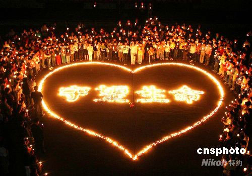 5月15日晚,山西省太原市雙語實驗小學(xué)400多名師生在校園操場上,將3000余支蠟燭擺成一個巨大的“心”和“守望生命”四個字,為四川災(zāi)民祈福。中新社發(fā) 華山大 攝