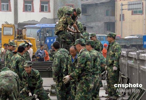 5月16日,由都江堰都往汶川的壽江公路大橋因地震山體移位造成橋面傾斜,車輛和機(jī)械無法通行。四川雅安民兵專業(yè)應(yīng)急分隊(duì)奉命迅速趕赴事發(fā)地點(diǎn),利用制式公路鋼橋?qū)κ軗p橋梁進(jìn)行加固。中新社發(fā) 吳蘇琳 攝