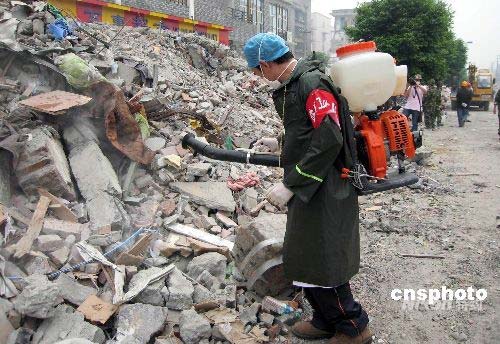 五月十七日,是汶川地震發(fā)生時(shí)間第六天,地震災(zāi)區(qū)都江堰市最大的市場荷花池市場已開始用大型挖掘機(jī)、裝載機(jī)清理倒塌的樓房和廢墟,并有專業(yè)人員進(jìn)行防疫消毒。中新社發(fā) 周丹鈺 攝