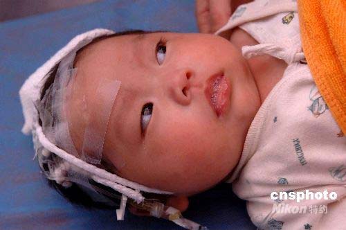 2008年5月17日下午,四川大學(xué)華西醫(yī)院抗震救災(zāi)急診部門(mén),接來(lái)一位出生剛80天,來(lái)自地震重災(zāi)區(qū)四川綿竹的女?huà),她的名字叫廖靜萱。廖靜萱目前腦部出現(xiàn)腦水腫,可能將要進(jìn)行腦部手術(shù),其右腿也帶有地震創(chuàng)傷。中新社發(fā) 鄒憲 攝