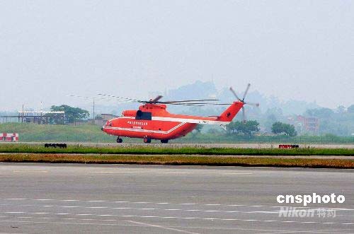5月17日中午,一架航班號為FD7802的M26多用途重型直升機經停重慶機場一小時后,飛赴四川災區(qū)執(zhí)行救援任務。據介紹,M26多用途重型直升機是目前世界上最大的直升機,其機身長約40米、機高11.6米、旋翼長32米,空機約重28噸,最大起飛權重達到56噸,最多可容納100余人,是實施救援的主戰(zhàn)直升機。自四川汶川地震發(fā)生后,毗鄰四川的重慶機場共保障抗震救災飛行共85架次。中新社發(fā) 肖漢飛 攝