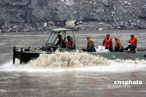 圖:成都軍區(qū)官兵出動軍用船運(yùn)送災(zāi)民