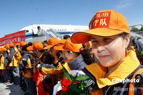 5月18日下午,由新疆多家醫(yī)療機構(gòu)醫(yī)護專家組成首批抗震救災(zāi)醫(yī)療防病救援隊從新疆烏魯木齊國際機場乘專機前往四川汶川地震災(zāi)區(qū)實施醫(yī)療救助和疫情防御工作,同時30噸救援所需的藥品和物資也隨救援隊一同被運往地震災(zāi)區(qū)。據(jù)了解,新疆首批抗震救災(zāi)醫(yī)療防病救援隊共計90人,由維、漢、哈、回等各族醫(yī)護工作者組成,其中女性24名。當(dāng)日上午7輛救援工作車已從烏魯木齊出發(fā),趕向四川災(zāi)區(qū),預(yù)計54小時即可到達(dá)災(zāi)區(qū)。中新社發(fā) 劉新 攝