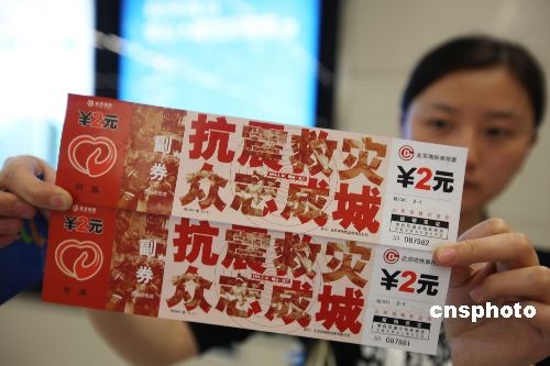 5月18日,北京地鐵首次發(fā)行的“特種”愛心附捐車票出現(xiàn)在北京地鐵所有車站售票臺,這套附帶為地震災(zāi)區(qū)捐款獻(xiàn)愛心的文化車票受到了市民的青睞,北京地鐵公司將把附捐的40萬元愛心款全部轉(zhuǎn)交中國紅十字會。這套愛心附捐車票發(fā)行總量為10萬套,每張車票售價4元,其中包括2元捐給災(zāi)區(qū)的款項。中新社發(fā) 老羅 攝