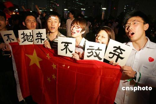 5月19日晚,數(shù)千名上海市民自發(fā)前往人民廣場(chǎng),點(diǎn)亮十萬(wàn)支蠟燭為四川地震遇難者祈福。眾多青年在現(xiàn)場(chǎng)高唱國(guó)歌,為中國(guó)加油,為四川加油。中新社發(fā) 湯彥俊 攝