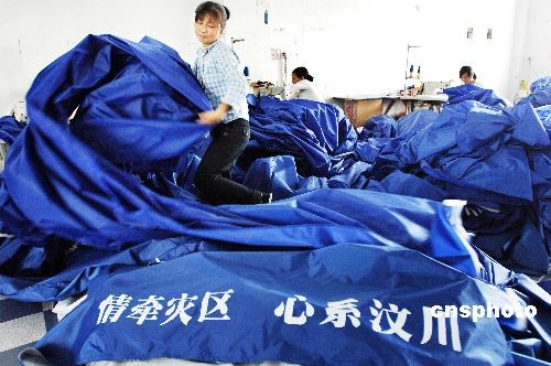 5月20日,浙江杭州一雨具制品廠的女工們在日夜趕制災區(qū)急需的救災專用帳篷。據(jù)了解, 該廠急災區(qū)所急,放棄其他雨具生產(chǎn),每天開足馬力生產(chǎn)帳篷,產(chǎn)量達300頂,比平時增加一倍,并實行微利銷售。目前已有2000多頂救災專用帳篷送往四川、陜西等地震重災區(qū)。